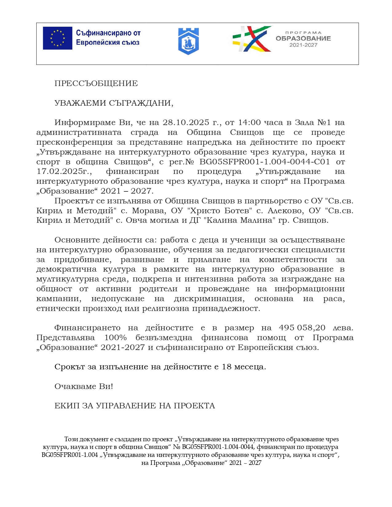Информираме Ви, че на 28.10.2025 г., от 14:00 часа в Зала №1 на административната сграда на Община Свищов ще се проведе пресконференция за представяне напредъка на дейностите по проект „Утвърждаване на интеркултурното образование чрез култура, наука и спорт в община Свищов“, с рег.№ BG05SFPR001-1.004-0044-С01 от 17.02.2025г., финансиран по процедура „Утвърждаване на интеркултурното образование чрез култура, наука и спорт“ на Програма „Образование“ 2021 – 2027.
