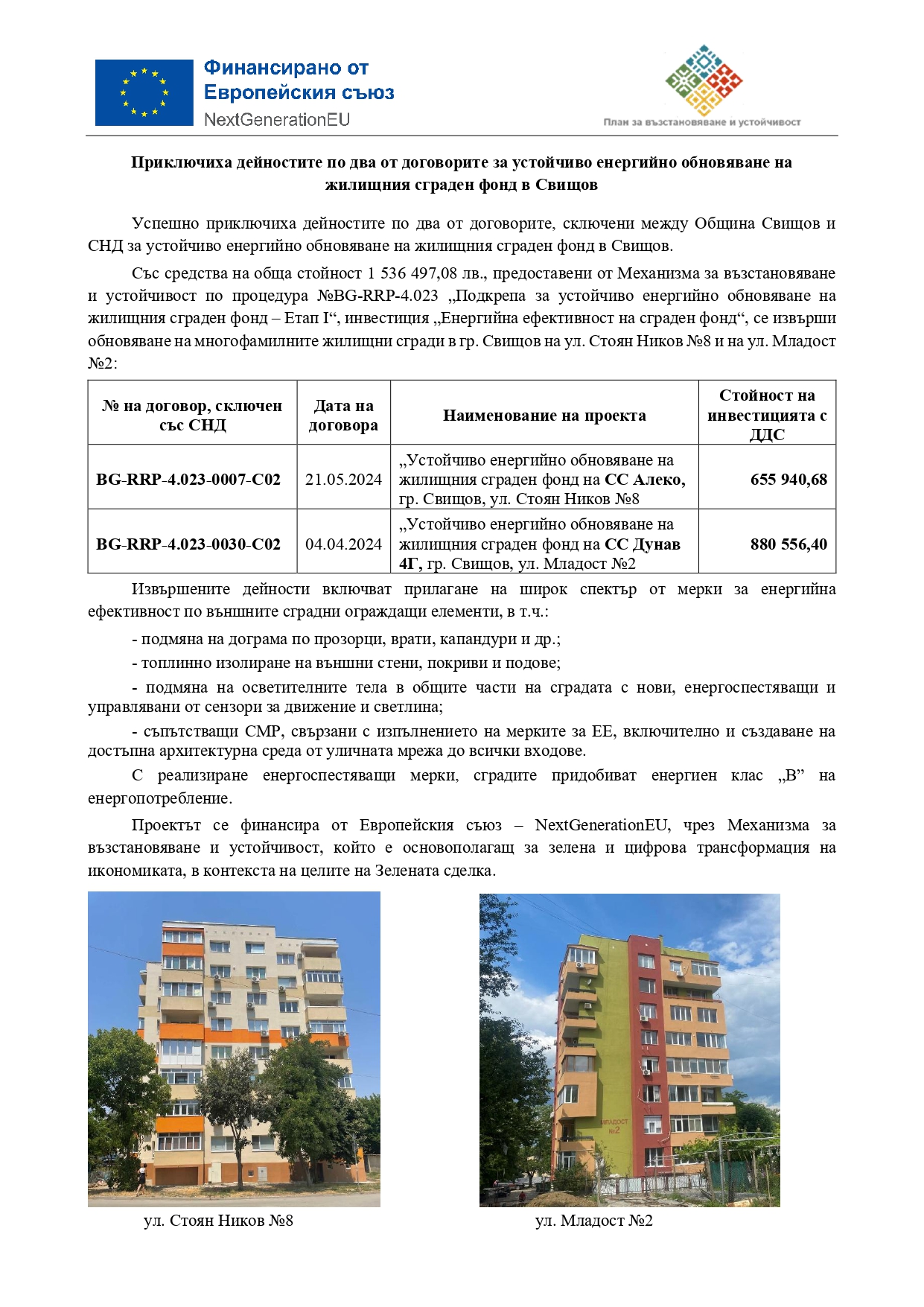 Със средства на обща стойност 1 536 497,08 лв., предоставени от Механизма за възстановяване и устойчивост по процедура №BG-RRP-4.023 „Подкрепа за устойчиво енергийно обновяване на жилищния сграден фонд – Етап I“, инвестиция „Енергийна ефективност на сграден фонд“, се извърши обновяване на многофамилните жилищни сгради в гр. Свищов на ул. Стоян Ников №8 и на ул. Младост №2, както следва: