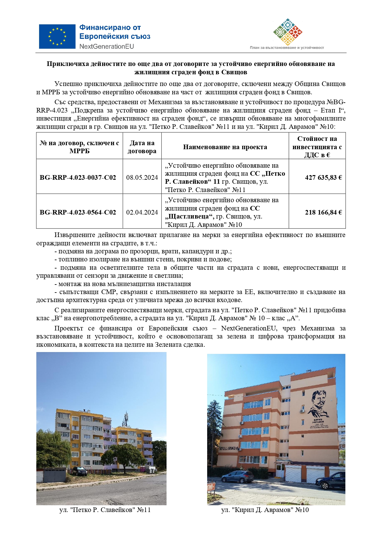 Със средства, предоставени от Механизма за възстановяване и устойчивост по процедура №BG-RRP-4.023 „Подкрепа за устойчиво енергийно обновяване на жилищния сграден фонд – Етап I“, инвестиция „Енергийна ефективност на сграден фонд“, се извърши обновяване на многофамилните жилищни сгради в гр. Свищов на ул. "Петко Р. Славейков" №11 и на ул. "Кирил Д. Аврамов" №10: