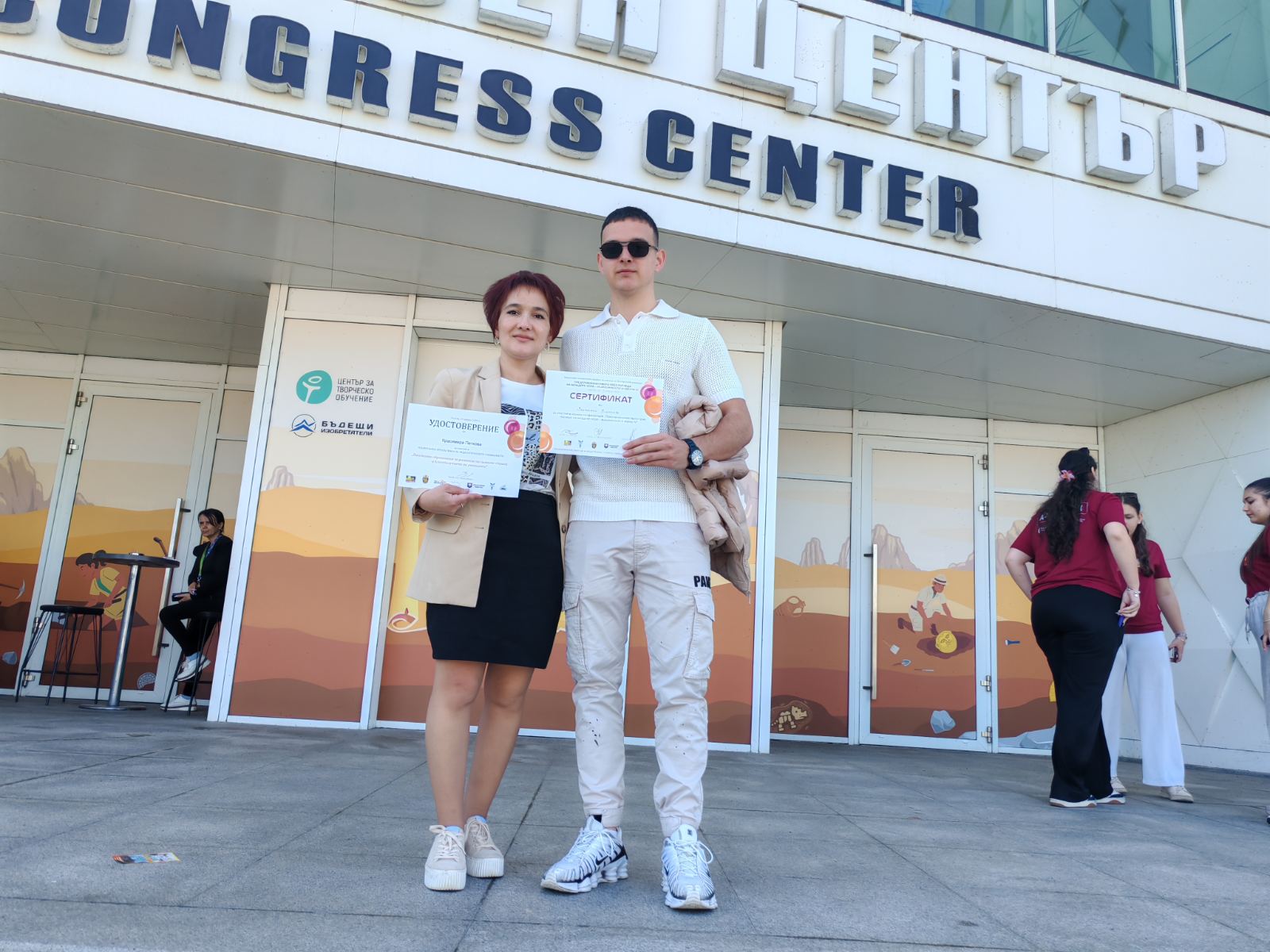 Ученик и преподавател от ПДТГ „Димитър Хадживасилев“ представиха успешно иновативен проект в рамките на Четвъртата национална научна конференция „Предприемачеството през погледа на младите хора – възможности и мечти IV“, проведена в периода 23–25 април 2026 г. в Бургас.