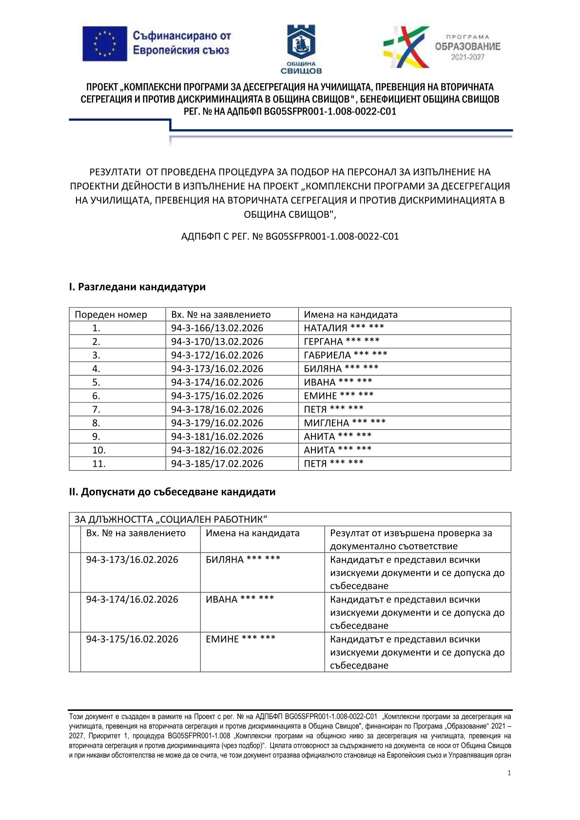РЕЗУЛТАТИ ОТ ПРОВЕДЕНА ПРОЦЕДУРА ЗА ПОДБОР НА ПЕРСОНАЛ ЗА ИЗПЪЛНЕНИЕ НА ПРОЕКТНИ ДЕЙНОСТИ В ИЗПЪЛНЕНИЕ НА ПРОЕКТ „КОМПЛЕКСНИ ПРОГРАМИ ЗА ДЕСЕГРЕГАЦИЯ НА УЧИЛИЩАТА, ПРЕВЕНЦИЯ НА ВТОРИЧНАТА СЕГРЕГАЦИЯ И ПРОТИВ ДИСКРИМИНАЦИЯТА В ОБЩИНА СВИЩОВ", АДПБФП С РЕГ. № BG05SFPR001-1.008-0022-C01