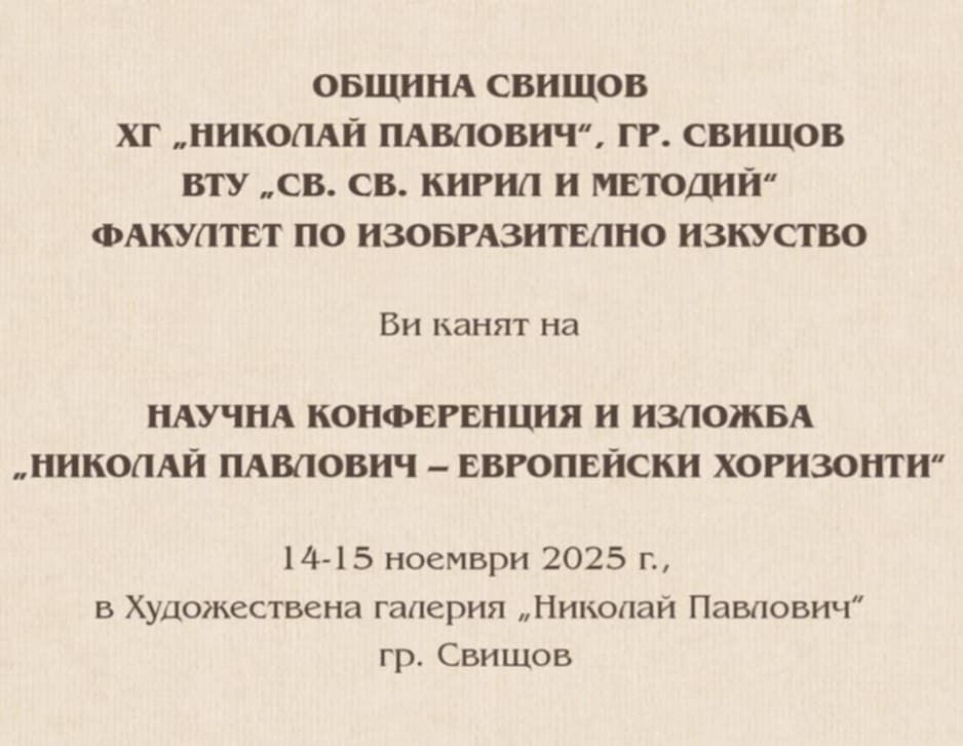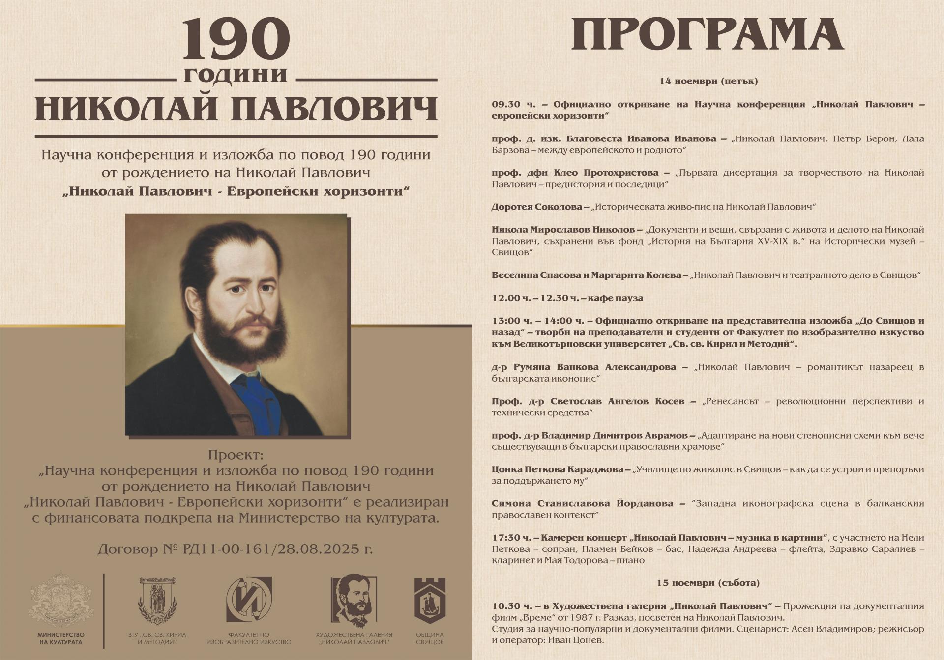 Община Свищов, Художествена галерия „Николай Павлович“ – гр. Свищов и Факултетът по изобразително изкуство към ВТУ „Св. св. Кирил и Методий“ Ви канят на Научна конференция и изложба, посветени на 190 години от рождението на бележития свищовски художник Николай Павлович. Тържественото събитие ще се състои на 14 и 15 ноември 2025 г. в град Свищов, с финансовата подкрепа на Министерство на културата. На 14 ноември в Художествената галерия, от 9.30 часа ще бъде дадено официално начало на Научната конференция „Николай Павлович – европейски хоризонти“, а от 13.00 часа, отново там ще бъде открита и представителната изложба „До Свищов и назад“, която ще представи творби на преподаватели и студенти от Факултет по изобразително изкуство към Великотърновски университет „Св. св. Кирил и Методий“. На 15 ноември от 10.30 часа, в Галерията ще бъде прожектиран документалният филм „Време“ от 1987 г., който е своеобразен разказ, посветен на Николай Павлович.