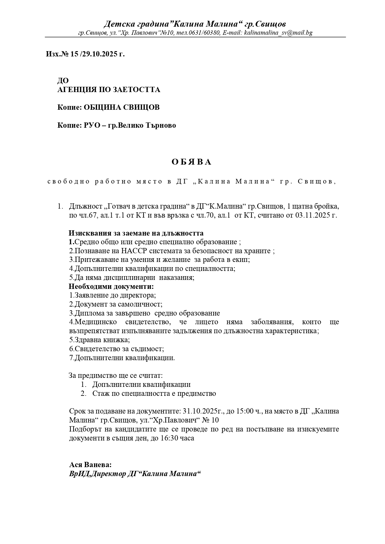 Детска градина „Калина Малина“ – гр. Свищов обявява свободно работно място за длъжността „Готвач в детска градина“ – 1 щатна бройка, по чл. 67, ал. 1, т. 1 и във връзка с чл. 70, ал. 1 от Кодекса на труда, считано от 03.11.2025 г.