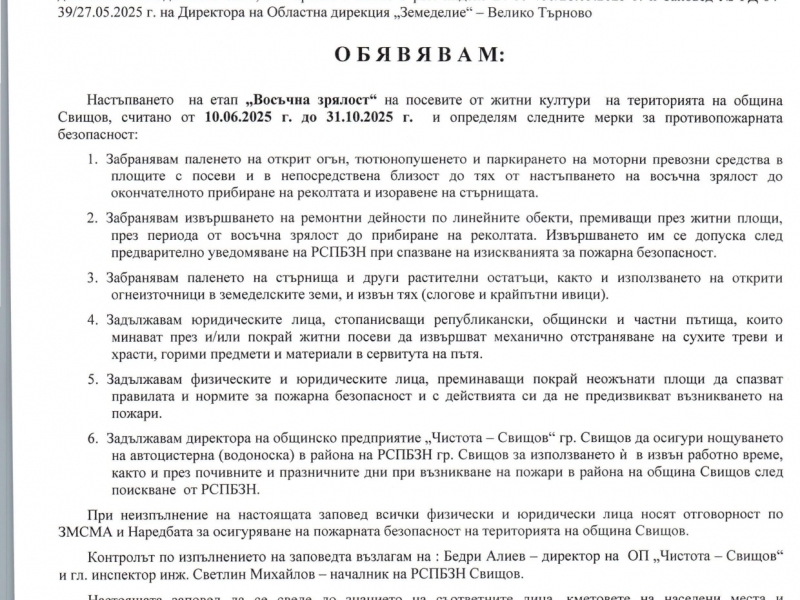 Настъпването на етап „Восъчна зрялост“ на посевите от житни култури на територията на община Свищов, считано от 06.06.2025 г. и определям следните мерки за противопожарната безопасност: