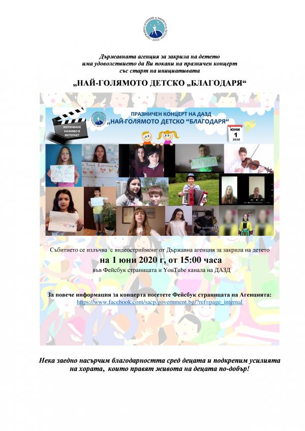 ДАЗД Ви кани да се включите в концерта и да подкрепите инициативата „Най-голямото детско „благодаря“. На празника ще стартира набирането на кратки видеа, в които деца благодарят на своето семейство, на приятели, на близки и на всички важни за тях хора. Целта е да се съберат колкото се може повече на брой видеа, с които да се кандидатства за рекорд на Гинес.