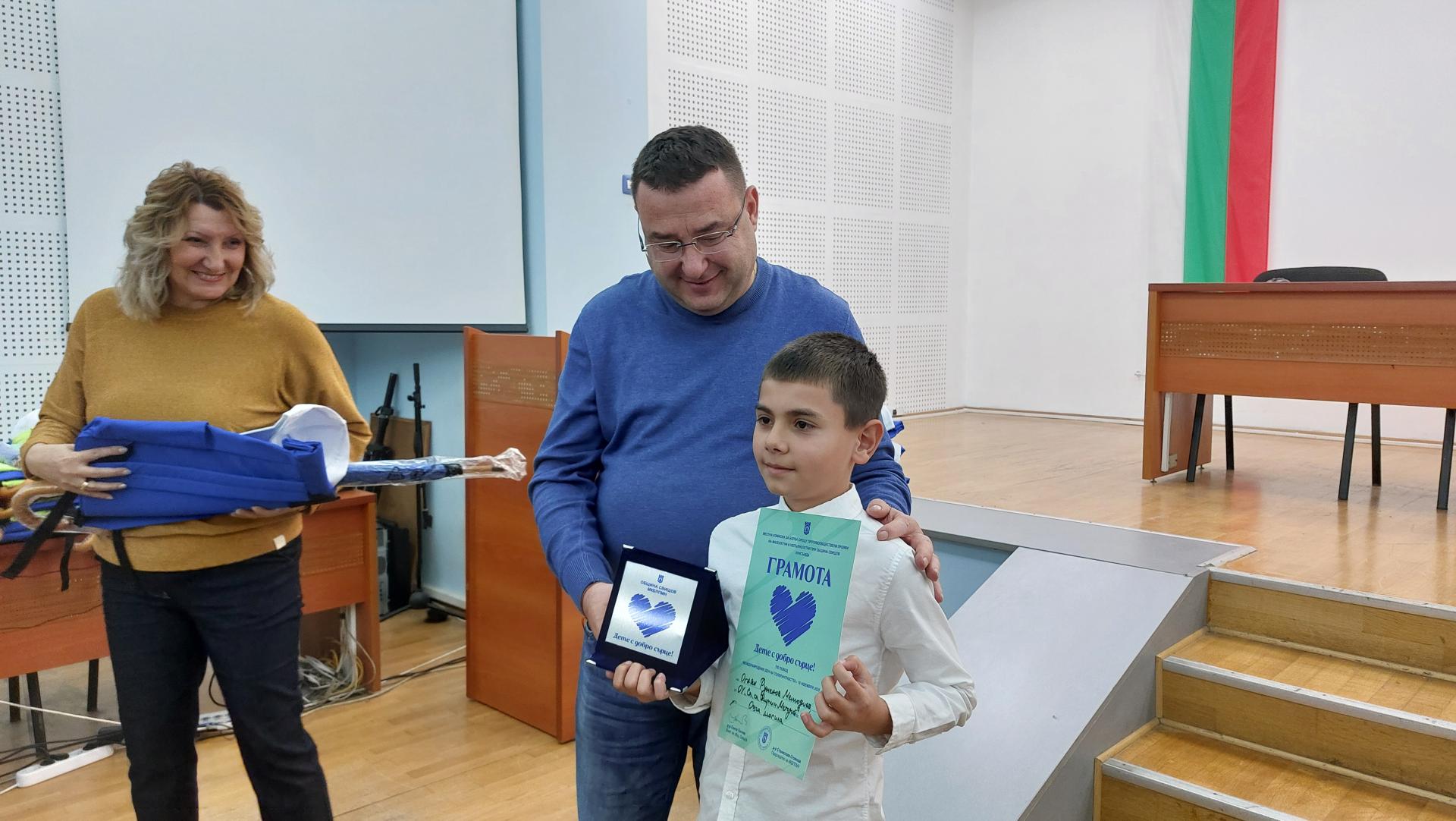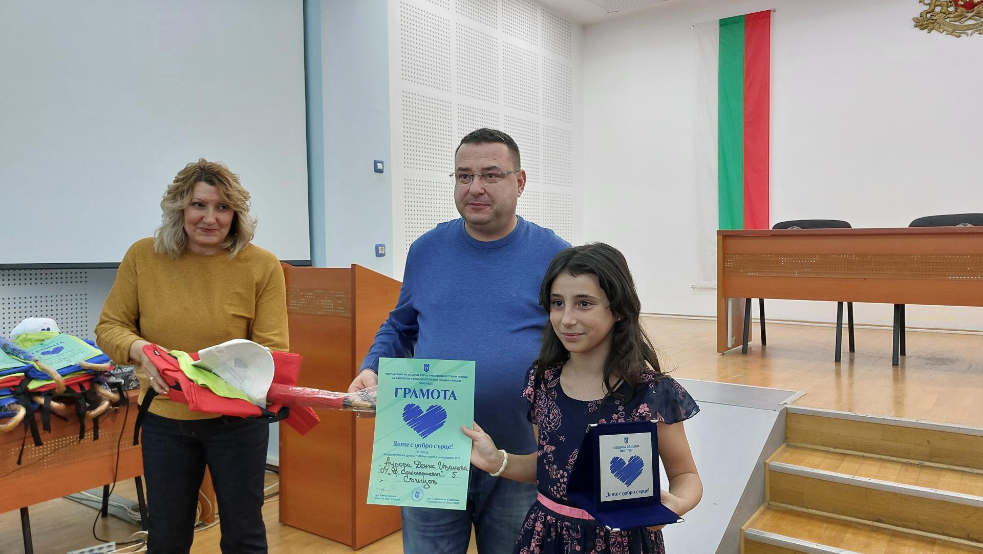 На 17 ноември, в Зала 1 на Общината бе организирана церемония по награждаване на всичките 32 деца с добри сърца, които бяха поздравени лично от кмета на община Свищов Генчо Генчев и секретаря на местната комисия Вера Блажева. Учениците, на възраст от 8 години до 18 години, сред които и дете със специални потребности, бяха посочени като пример за достойно поведение, а за извършените добри дела те получиха грамота, плакет и подаръци, с които им бе засвидетелствано внимание. Някои от наградените ученици споделиха, че са оказали помощ на деца в неравностойно положение или на деца със социална и материална нужда; други, че са върнали на притежателите им пари, загубена вещ или телефон; а трети, че са оказали помощ на възрастни хора с прибиране на дърва, при пазаруване и др.