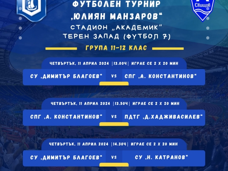 Община Свищов, Фондация "Ангели от Лим" и ОФК "Академик" ви канят на междуучилищния футболен турнир "Юлиян Манзаров", който ще се проведе на 11 април, четвъртък на стадион "Академик" и изкуствено игрище "Академика".