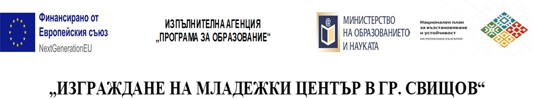 Във връзка с изпълнение дейностите по проект „Изграждане на Младежки център в гр. Свищов“, Договор по НПВУ № BG-RRP-1.009-0001-С01/10.01.2024 г, Стълб 1 „Иновативна България“, Компонент 1: Образование и умения“ по процедура BG-RRP-1.009 - А2 ИЗГРАЖДАНЕ НА МЛАДЕЖКИ ЦЕНТРОВЕ (в градове, които не са областни), за изпълнение на проект BG-RRP-1.009-0001 “Изграждане на младежки център в гр. Свищов“ и съгласно Заповед № 214-РД-01-03 от 25.11.2025 г. на Кмета на Община Свищов, се открива процедура за подбор на персонал за изпълнение на дейност 4: Сформиране на екип на „Младежки център – Свищов“ и обучение на персонала: