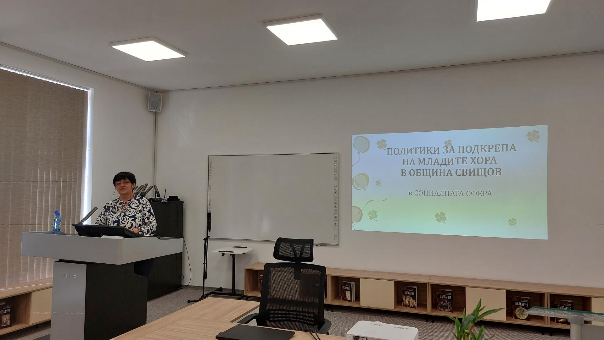 Ръководителят на ОС "Социални дейности" към община Свищов Анелия Димитрова направи презентация, в която показа различните социални услуги, функциониращи активно на територията на общината като подчерта, че в момента 10 млади хора до 29 години се реализират успешно и прилагат знанията, уменията и компетенциите си в дейностите на социалните центрове в Свищов. Тя сподели също, че през 2025 година социална подкрепа са получили 242 деца и млади хора до 18-годишна възраст, а социалните програми, които се реализират за подобряване условията на живот и труд на младите хора в общината са насочени към – социално включване и подобряване качеството на живот, насърчаване на заетостта и уменията, социална интеграция и адаптация, и преодоляване на социалните различия.