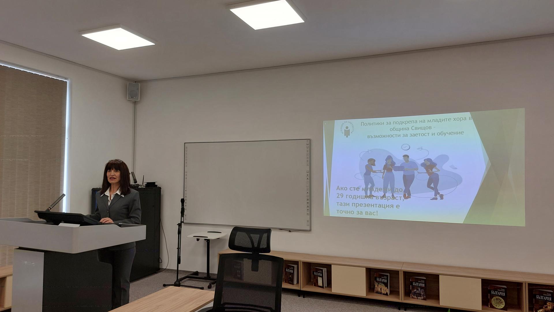 Директорът на Дирекция „Бюро по труда“ Татяна Александрова също представи възможностите, които се предоставят за професионална реализация, адаптация към пазара на труда и подкрепа от Агенцията по заетостта, като акцентира върху реалните възможности за включване на младите хора до 29 години към обучения за допълнителна квалификация, младежка заетост и стажове. Тя обърна внимание на активния в момента проект "Младежка заетост + компонент 2" и възможностите за включване в него на младежи от 16 до 29 години, търсещи работа. Също така тя отбеляза и вариантите за надграждане на знания и умения, които се разкриват чрез съдействието на ДБТ, както и различните видове компетенции – езикови, компютърни и др., които могат да се придобият и да окажат благоприятно влияние за професионалното развитие на младите хора.
