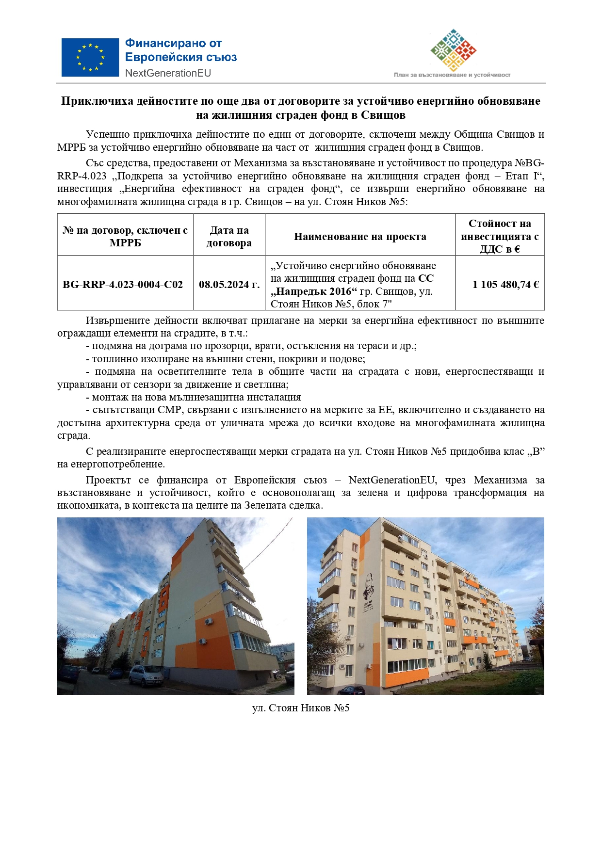 Наименование на проекта: „Устойчиво енергийно обновяване на жилищния сграден фонд на СС „Напредък 2016“ гр. Свищов, ул. Стоян Ников №5, блок 7", с № на договор, сключен с МРРБ BG-RRP-4.023-0004-С02, от дата 08.05.2024 г. и стойност на инвестицията с ДДС 105 480,74 €.