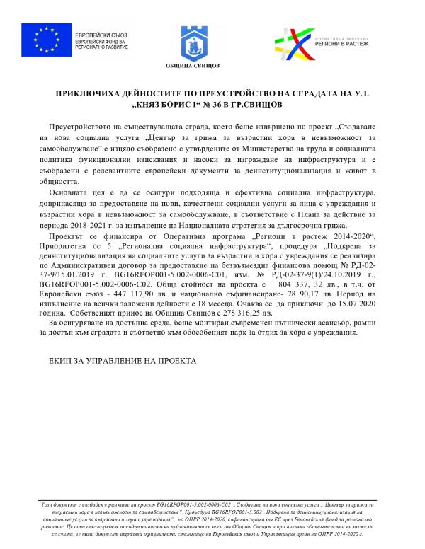 ПРИКЛЮЧИХА ДЕЙНОСТИТЕ ПО ПРЕУСТРОЙСТВО НА СГРАДАТА НА УЛ. „КНЯЗ БОРИС І“ № 36 В ГР.СВИЩОВ