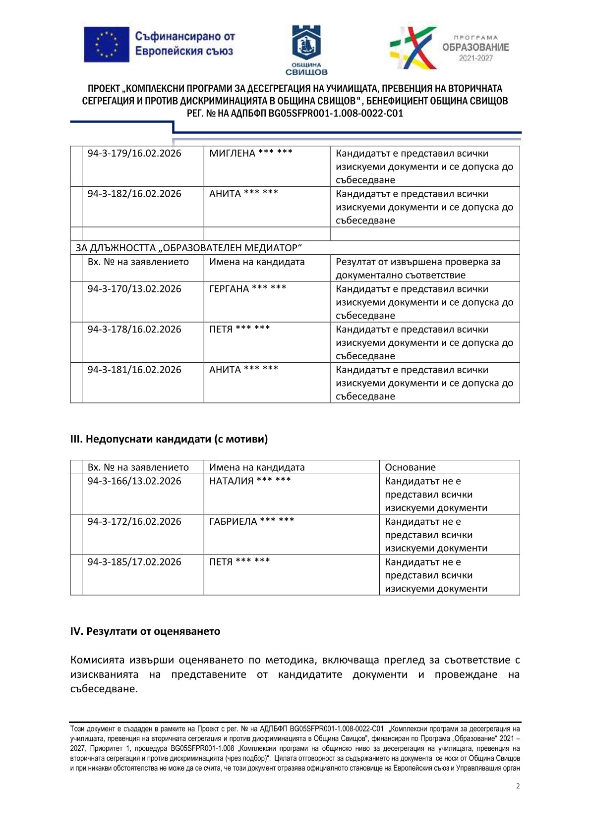 РЕЗУЛТАТИ ОТ ПРОВЕДЕНА ПРОЦЕДУРА ЗА ПОДБОР НА ПЕРСОНАЛ ЗА ИЗПЪЛНЕНИЕ НА ПРОЕКТНИ ДЕЙНОСТИ В ИЗПЪЛНЕНИЕ НА ПРОЕКТ „КОМПЛЕКСНИ ПРОГРАМИ ЗА ДЕСЕГРЕГАЦИЯ НА УЧИЛИЩАТА, ПРЕВЕНЦИЯ НА ВТОРИЧНАТА СЕГРЕГАЦИЯ И ПРОТИВ ДИСКРИМИНАЦИЯТА В ОБЩИНА СВИЩОВ", АДПБФП С РЕГ. № BG05SFPR001-1.008-0022-C01
