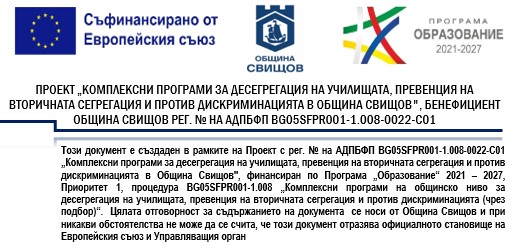 Във връзка с изпълнение дейностите по Административен договор за предоставяне на безвъзмездна финансова помощ с рег. № BG05SFPR001-1.008-0022-C01 за изпълнение на проект „Комплексни програми за десегрегация на училищата, превенция на вторичната сегрегация и против дискриминацията в Община Свищов", финансиран по Програма „Образование“ 2021 – 2027, Приоритет 1, процедура BG05SFPR001-1.008 „Комплексни програми на общинско ниво за десегрегация на училищата, превенция на вторичната сегрегация и против дискриминацията (чрез подбор)“ Ви информираме, че резултатите от проведената процедура за подбор на персонал са достъпни в публикуваните документи.