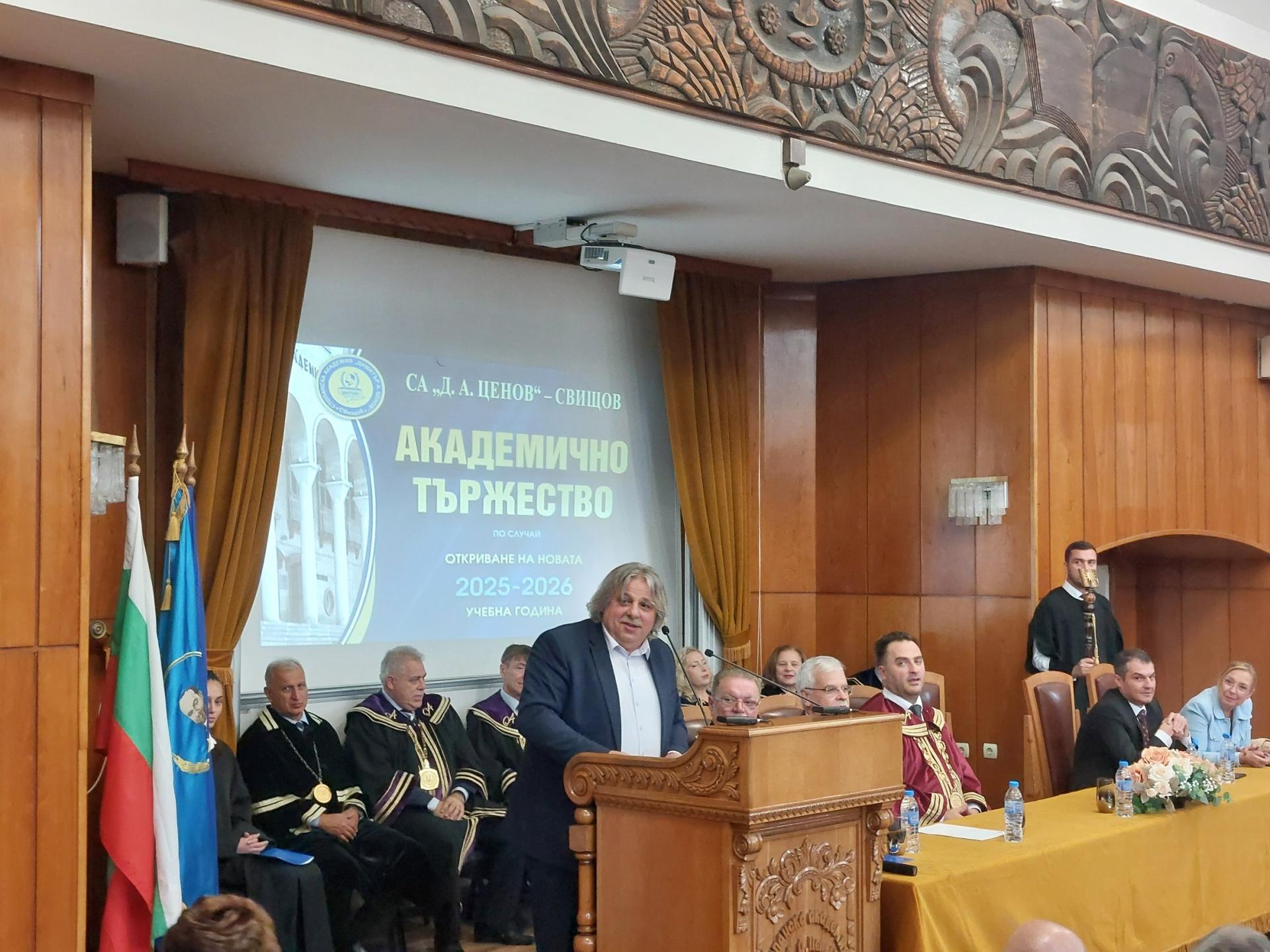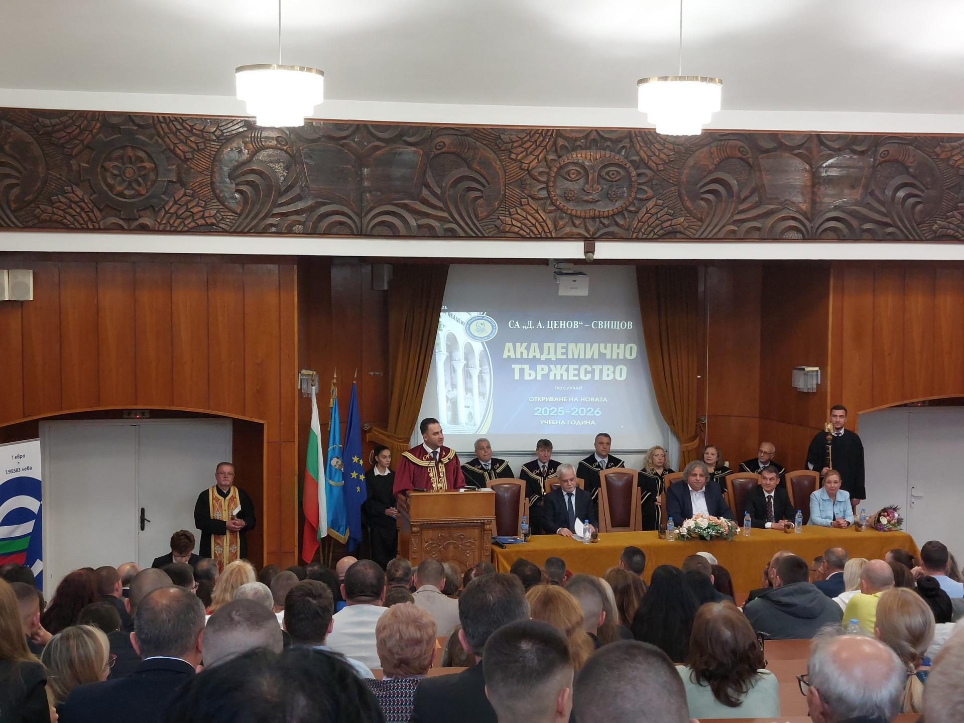 Стопанска академия „Димитър А. Ценов” – гр. Свищов тържествено откри новата академична 2025/2026 година. На юбилейното тържество, което даде старт на 90-тата учебна година в свищовското висше учебно заведение, присъстваха зам.-министърът на образованието и науката акад. Николай Витанов, зам.-министърът на туризма Павлин Петров, председателят на Икономическия и социален съвет Зорница Русинова, председателят на Общински съвет – Свищов д-р Кристиян Кирилов и редица специални гости, сред които и представители на общинското ръководство в лицето на секретаря на община Свищов Любомира Петрова и директора на дирекция "Култура и културно наследство" д-р Росен Маринов.