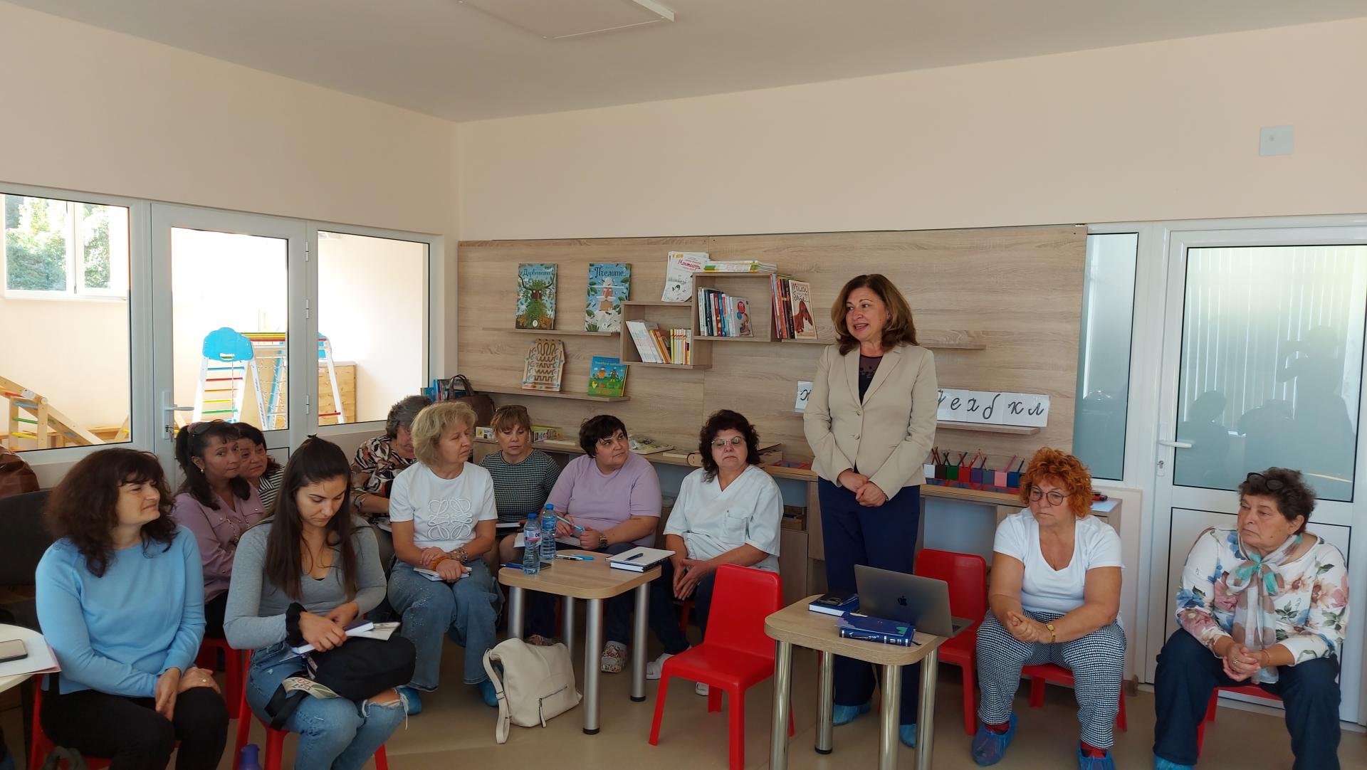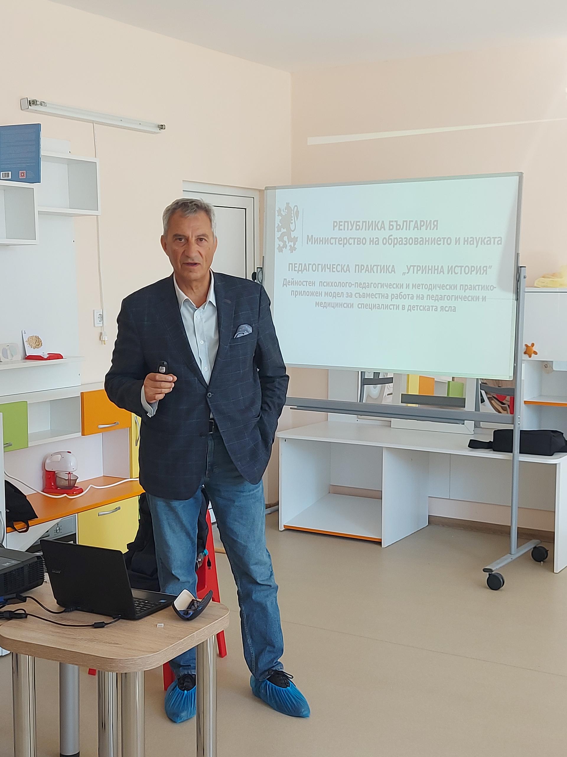 Днес, в ДГ „Васил Левски“, изнесена група на ул. „Плевенско шосе“ №5, се проведе обучение на тема „Цел, задачи и методически насоки на педагогическата практика „Утринна история“. Семинарът е част от реализацията на проект, финансиран по Националната програма „Умения на фокус“, модул 4 „Позитивни нагласи“ и е свързан с апробирането на дейностен психолого-педагогически и методически практико-приложен модел за съвместна работа на педагогически и медицински специалисти в детските ясли. Моделът се апробира в 15 детски градини в България, като тенденцията и нагласите са да се превърне в устойчиво обучение в ранна детска възраст, предвид промените в Закона за предучилищното и училищното образование.