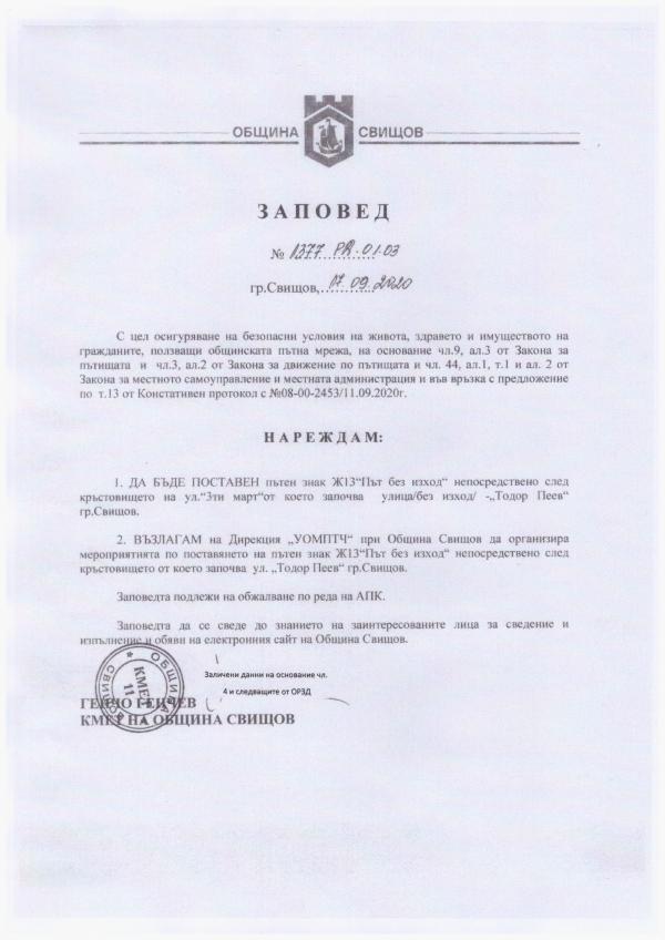З А П О В Е Д № 1377 РД-01-03 гр.Свищов,17.09.2020 г.